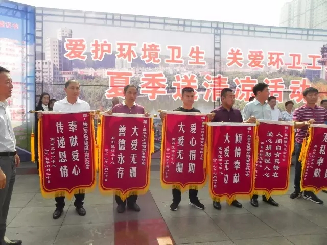 圖為:環(huán)衛(wèi)中心也向愛心企業(yè)回贈(zèng)榮譽(yù)錦旗一面