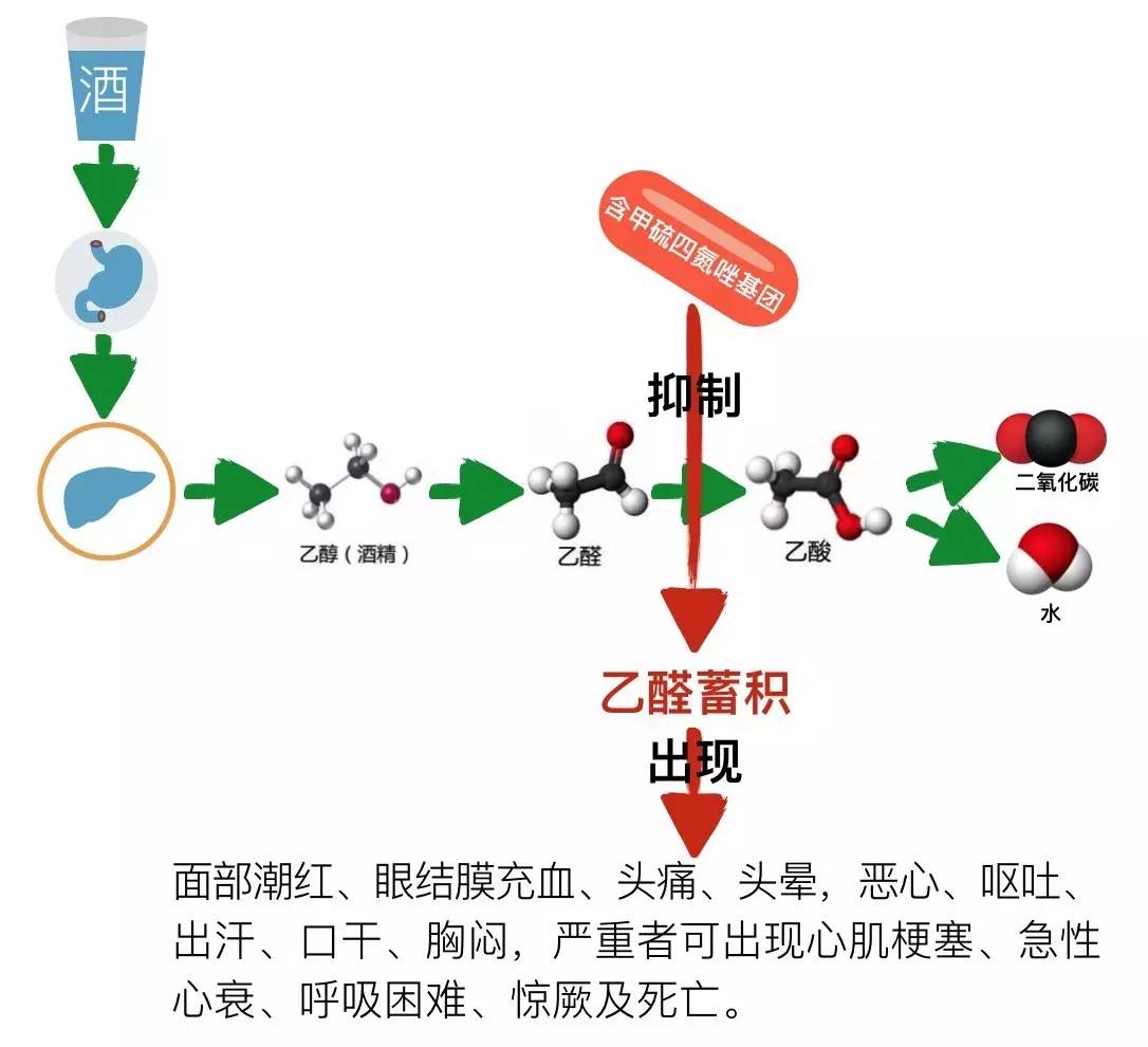 說到吃藥+喝酒要人命,大家比較熟悉的是使用************后喝酒要人命的藥源性雙硫侖樣反應(yīng)!當然不是所有的************都會引起藥源性雙硫侖樣反應(yīng)!一般都是含有甲硫四氮唑基團******才會引起!因其抑制肝臟中的乙醛脫氫酶,導(dǎo)致乙醇的中間代謝產(chǎn)物——乙醛代謝受阻,使血液中乙醛濃度增加而發(fā)生雙硫侖樣反應(yīng)!