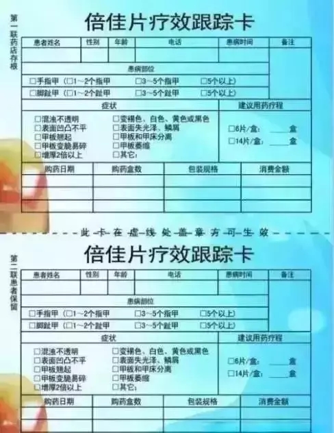 1、進店咨詢并確診為灰指甲的患者,可領(lǐng)取倍佳片療效跟蹤卡一張。